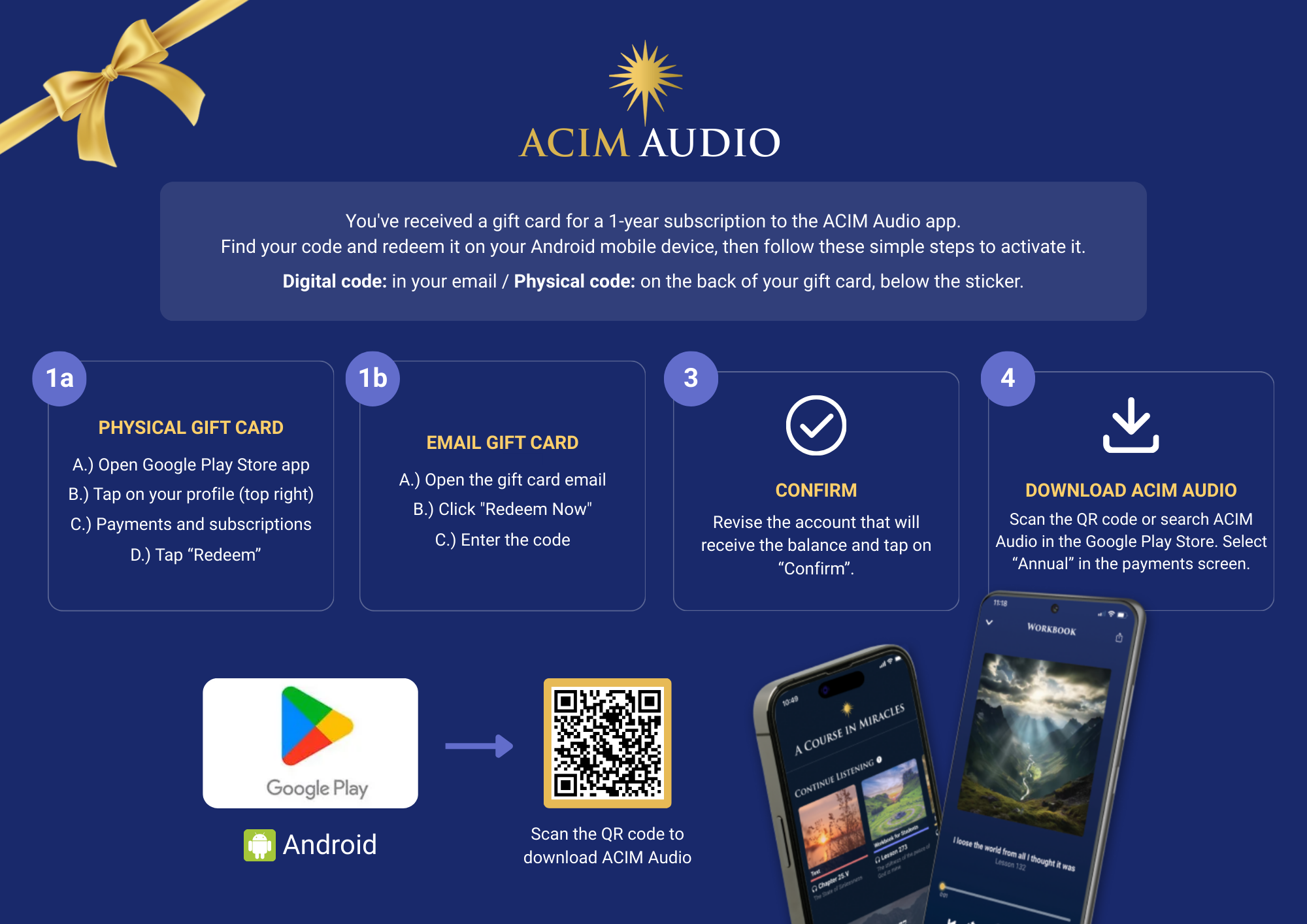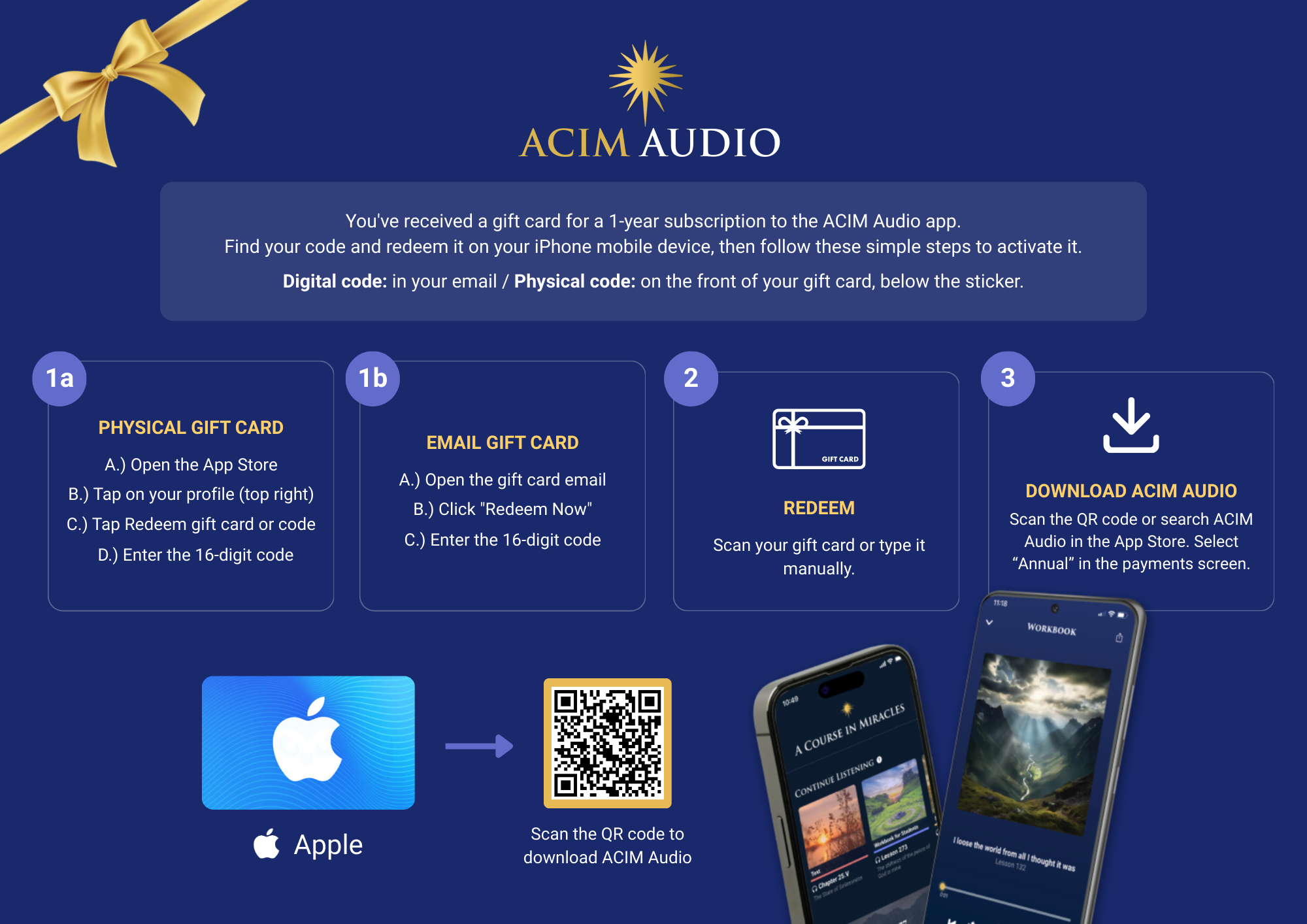 Easy steps the recipient can follow to redeem their gift card for the app