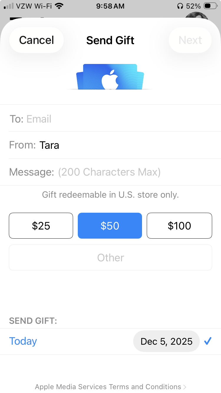 - From your iPhone go to —> App Store —> Profile (top right circle) —> Send Gift Card by Email —> Enter the recipient's email —> Choose amount (App price or more, see disclaimer*) —> The recipient will get an email with the gift card to redeem